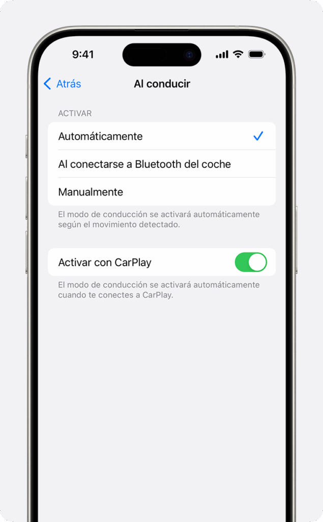 Aquí puedes elegir entre tres opciones: Automáticamente, Al conectar el Bluetooth del coche o Manualmente. Activa la función automáticamente solo si se detecta movimiento en el coche. Al conectar el Bluetooth del coche, activa la función cada vez que tu teléfono se conecta al Bluetooth del coche. La función se activa manualmente hasta que la desactives.